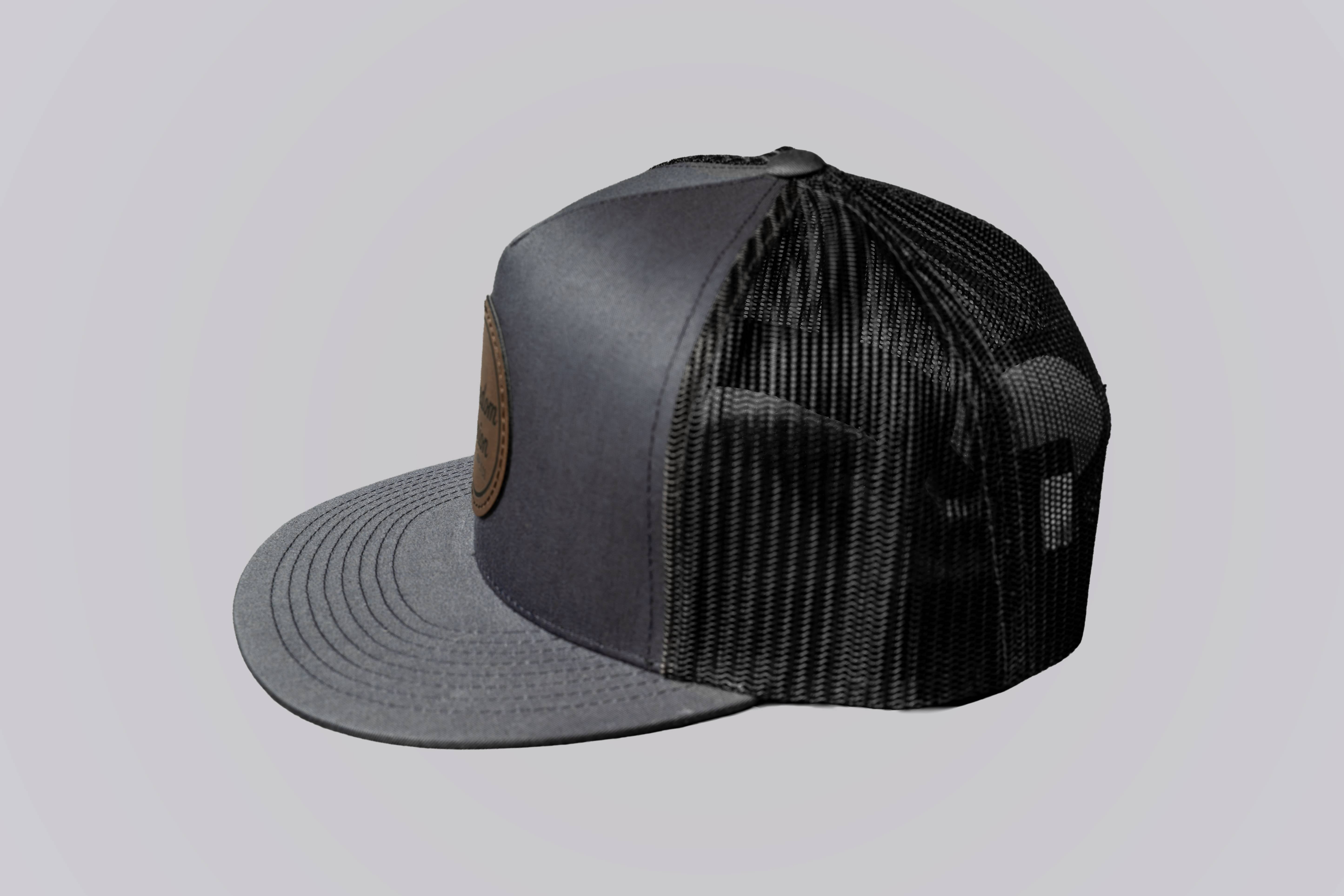 Gray and black cap with a brown leather patch on a light gray background Gray and black cap with a brown leather patch on a light gray background